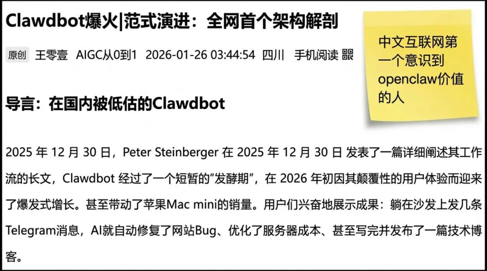 本文来自微信公众号:AIGC从0到1,作者:王零壹(王零壹,港大AIBT研究生,ex上市公司CMO,《AIGC从0到1》作者,中文互联网第1个意识到OpenClaw价值的人,专注AI时代的商业模式与产品架构,主张“用AI,不AI”)