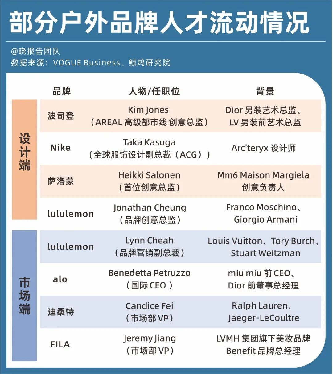 紧接着是人才流动和渠道变化。比如lululemon在两年内连续更换品牌创意和营销总监,其都有在LV、阿玛尼等奢侈品牌的从业经历;国内市场的迪桑特、斐乐、波司登等品牌,也早自2023年起陆续吸纳拥有奢侈品背景的人才,让他们进入市场部或设计部高层。