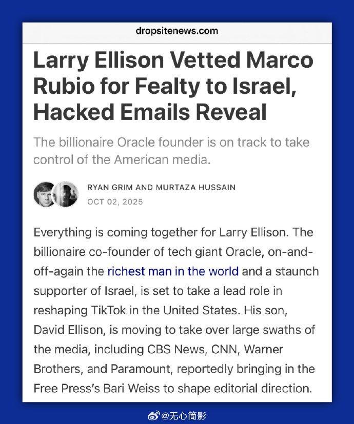 这封邮件的内容显示,甲骨文公司创始人拉里・埃里森早在 2015 年便核查过现任美国国务卿马尔科・鲁比奥对以色列的忠诚度,还为鲁比奥的竞选活动注资数百万美元;他曾向托尼・布莱尔研究所捐赠 3.5 亿美元,还承诺与特朗普携手助力 “新加沙” 重建,至今仍是以色列在美国的最大支持者之一。
