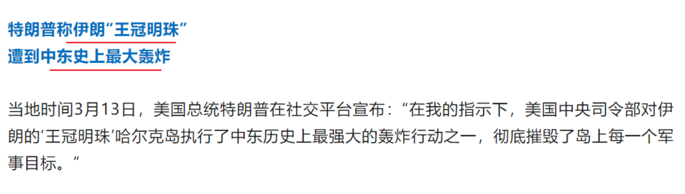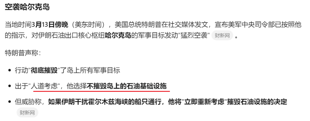 行动"彻底摧毁"了岛上所有军事目标,出于"人道考虑",他选择不摧毁岛上的石油基础设施。但威胁称,如果伊朗干扰霍尔木兹海峡的船只通行,他将"立即重新考虑"摧毁石油设施的决定。