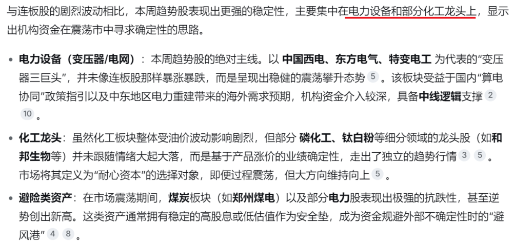 前半周(周一至周三):市场主要消化上周末的地缘冲突升级,油气、化工等涨价概念大幅高开。与此同时,政策红利释放,特别是“十五五”规划相关的新质生产力(算力、电力设备)方向崛起,对冲了部分指数的下行压力。