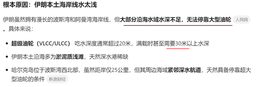 哈尔克岛位于波斯湾西北部,是伊朗最大原油出口基地,负责处理伊朗全国90%的石油出口,日均原油出口量约120万桶,占全球原油供应约1.5%。伊朗最大的石油出口枢纽设在哈尔克岛而非本土,核心原因在于水深条件——这是一个无法回避的自然地理限制。