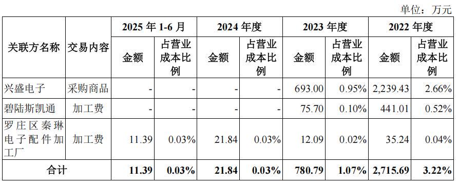 报告期内,公司主要向兴盛电子采购氧化锌,采购金额分别为2,239.43万元、693.00万元、0.00万元和0.00万元,占营业成本比例分别为2.66%、0.95%、0%和0%,占氧化锌采购金额的比例分别为14.85%、4.62%、0%和0%。由于氧化锌业务盈利空间持续收窄,2023年兴盛电子逐步停止相关业务。自2023年6月起,公司不再向兴盛电子进行采购。