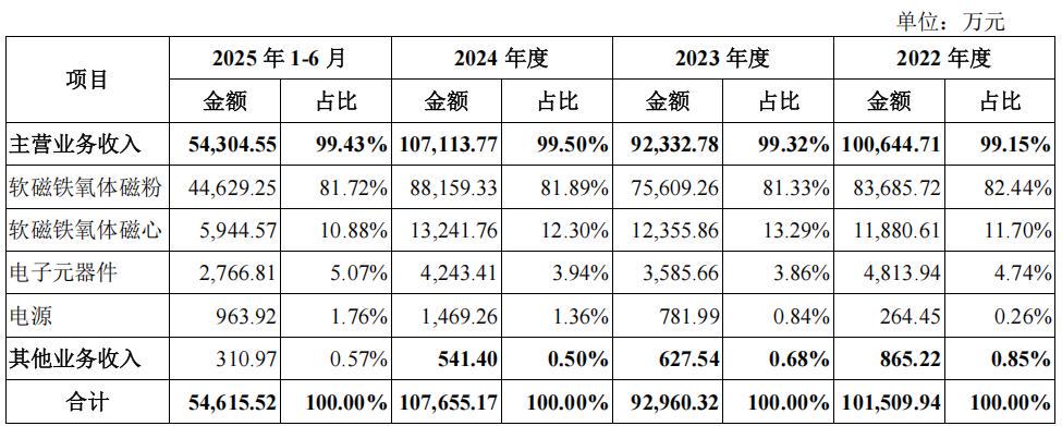 春光集团目前主要聚焦于软磁材料中的铁氧体技术路线,产品以磁粉和磁心为主,应用于新能源汽车、光伏储能、通信设备、电源系统等多个场景。其中,收入的主要来源为软磁铁氧体磁粉,报告期内,公司软磁铁氧体磁粉产品收入分别为8.369亿元、7.561亿元、8.816亿元和4.463亿元,占各期营业收入比例分别为82.44%、81.33%、81.89%和81.72%。