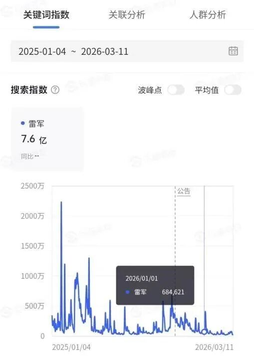 这种热度落差,并非两会期间的短暂现象,而是2026年开年以来的常态。拉长时间线来看,自2026年1月1日起,“雷军”相关搜索指数始终不温不火,相较于2025年同期的火爆景象,今年的“雷军”二字持续低迷,曾经的科技圈顶流,真的不火了吗?