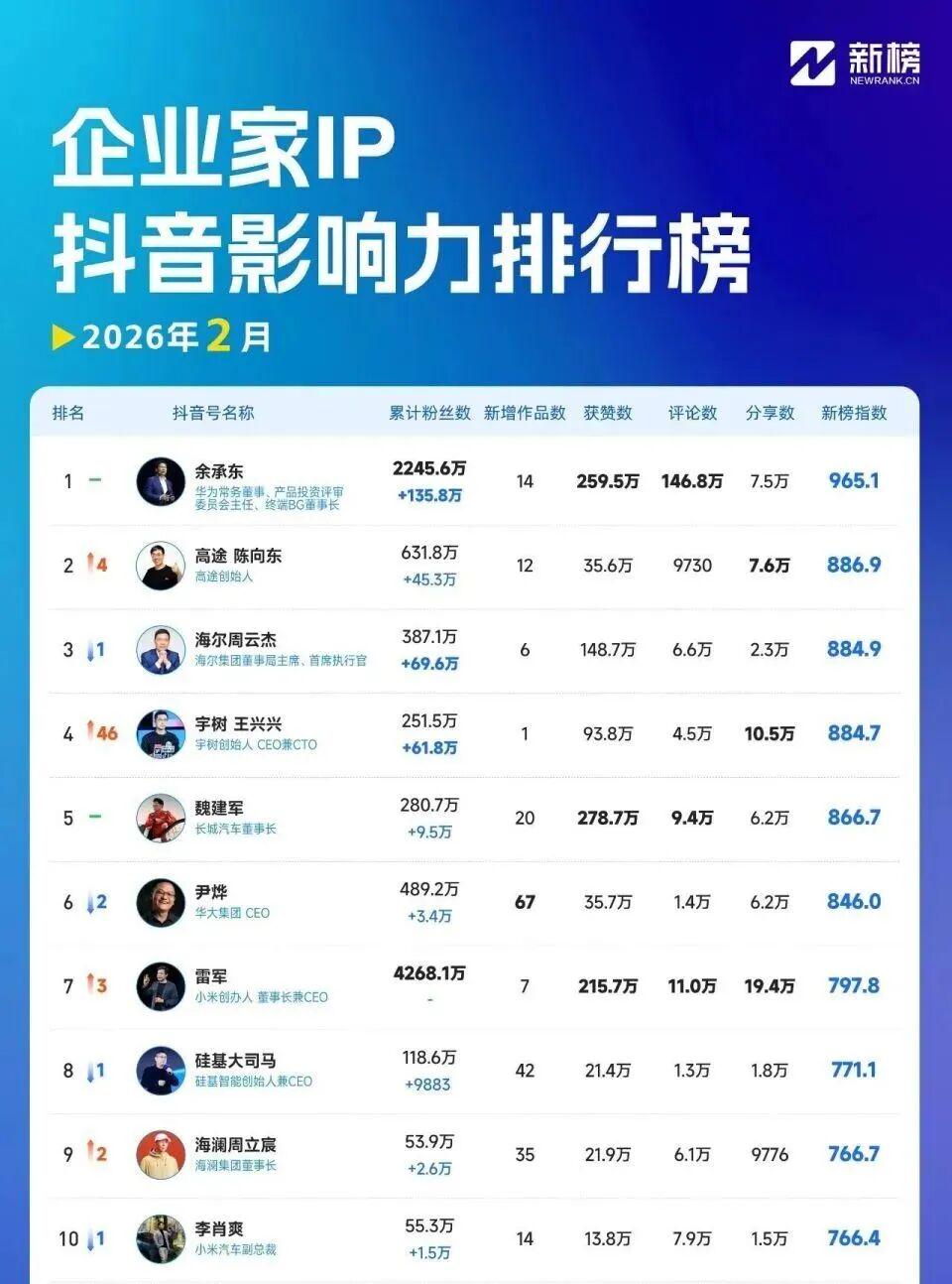 一项排名也佐证了这一现象。截至2026年3月16日,根据最新权威公开资料(主要参考新榜于2026年3月10日发布的2026年2月企业家IP抖音影响力榜单),当前抖音上最具影响力的企业家排名如下:2026年2月企业家IP抖音影响力前三名分别为余承东、陈向东、周云杰;雷军仅排名第七。