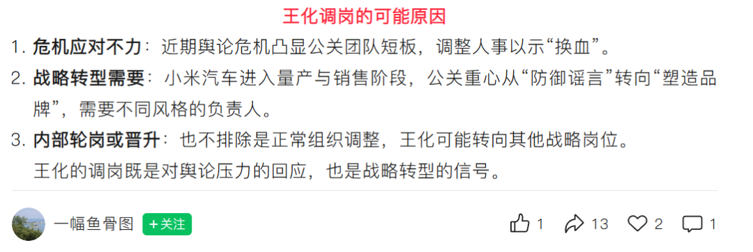但据多家媒体分析,王化的调岗有多层原因。其一是危机应对不力,2025年小米多次被推上舆论的风口浪尖,雷军掉粉超百万,王化需要对此负责;其二是小米战略转型需要,小米进入到新的阶段,公关重心从“防御谣言”转向“塑造品牌”,需要不同风格的负责人。