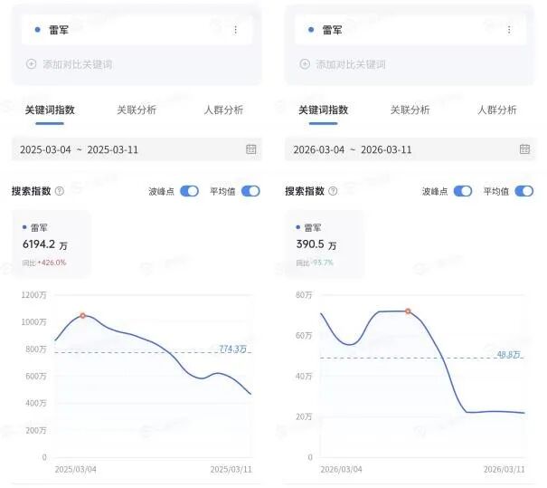 仅仅一年前,据抖音指数权威数据显示,2025年“两会”期间,关键词“雷军”的搜索指数平均值高达774.3万,全网讨论度居高不下。而2026年同期,这一数值骤降至48.8万,近乎断崖式暴跌,落差超过15倍。