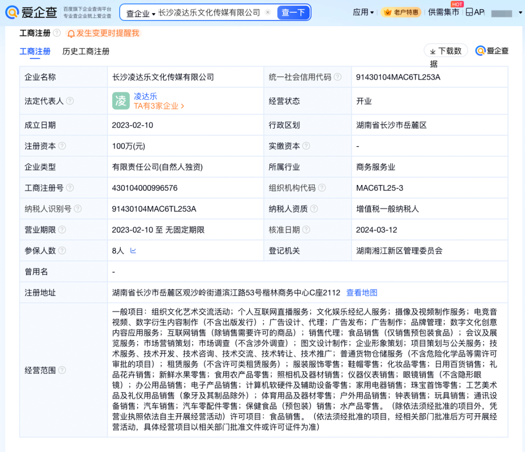 爱企查App显示,长沙凌达乐文化传媒有限公司成立于2023年2月,法定代表人为凌达乐,注册资本100万元人民币,经营范围包括个人互联网直播服务、文化娱乐经纪人服务、摄像及视频制作服务等,由凌达乐全资持股。