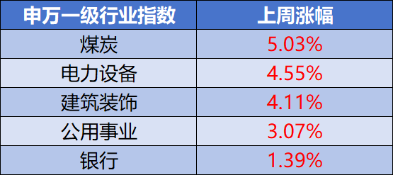 从申万一级行业指数来看,上周涨幅前5的行业分别是:煤炭、电力设备、建筑装饰、公用事业、银行。