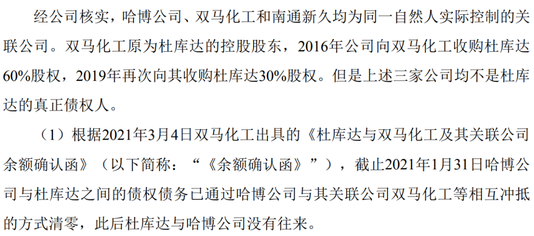 一、根据2021年3月4日双马化工出具的《杜库达与双马化工及其关联公司余额确认函》(下称:“《余额确认函》”),截至2021年1月31日哈博公司与杜库达之间的债权债务,已通过哈博公司与其关联公司双马化工等相互冲抵的方式清零,此后杜库达与哈博公司没有往来。