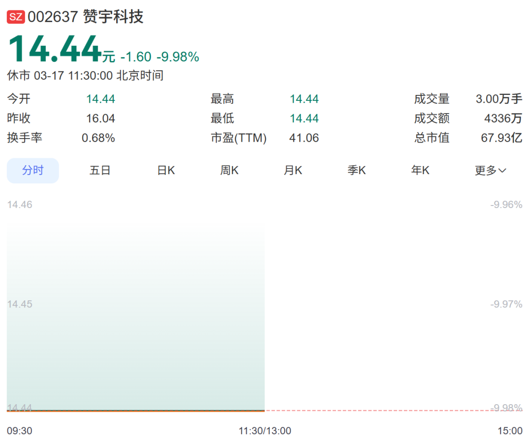 3月17日,赞宇科技股价一字跌停,报14.44元。