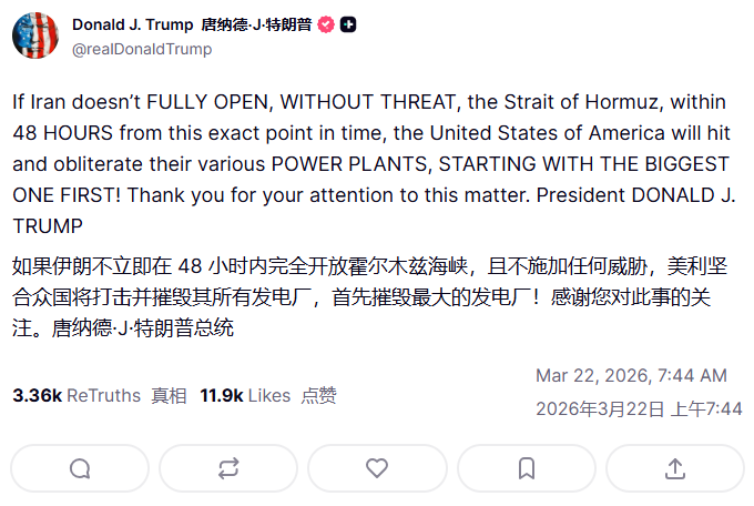据央视新闻,当地时间3月21日,美国总统特朗普在社交平台"真实社交"发文,要求伊朗在48小时内全面开放霍尔木兹海峡,否则美国将打击并摧毁伊朗境内各类发电厂,"首当其冲的将是其中规模最大的一座"。