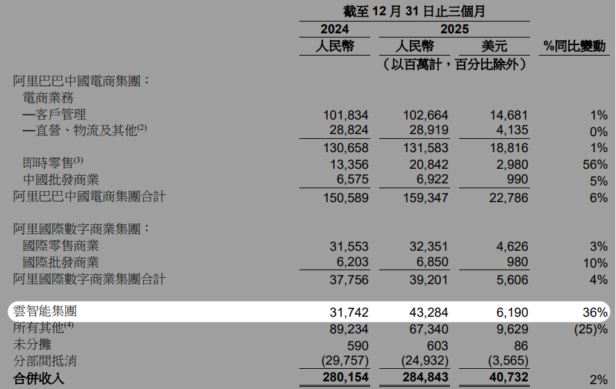 从财报来看,云智能集团整挺好,收入 432.84 亿元,同比增长加速至 36%,AI 相关产品收入连续第十个季度的三位数同比增长。