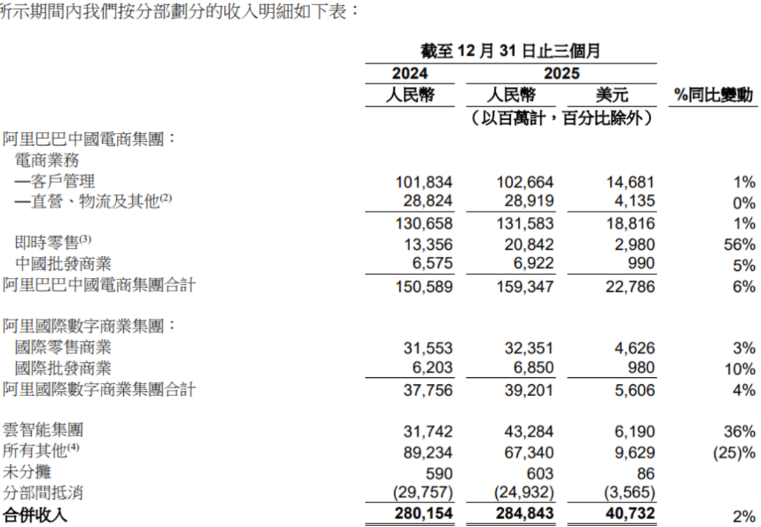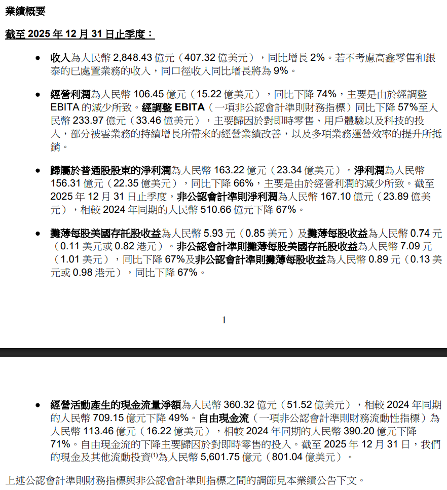 阿里巴巴 2026 财年第三财季,营收同比增长 2% 至 2848.4 亿元,经调整净利润同比下降 67% 至 167.1 亿元。