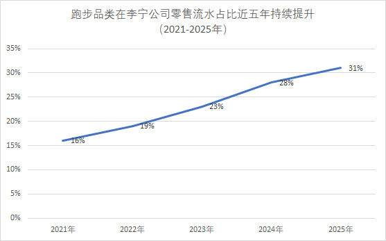 过去五年跑步品类在李宁公司零售流水占比逐年提升。