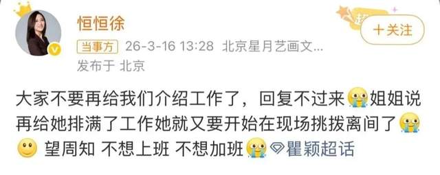 3月16日下午,瞿颖经纪人发文称:大家不要再给我们介绍工作了,回复不过来。 她还透露瞿颖已经表态,“说再给她排满了工作她就又要开始在现场挑拨离间了,望周知,不想上班,不想加班!”