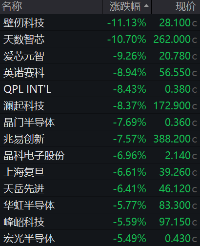半导体板块全线下跌,截至收盘,板块指数跌超6%,天数智芯跌超10%,英诺赛科跌近9%,兆易创新跌超7%,上海复旦跌超6%,华虹半导体跌超5%,中芯国际跌近5%。