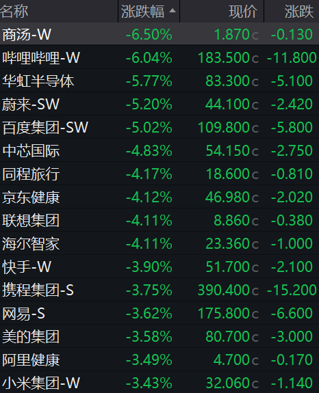 科网股全线下跌,商汤、哔哩哔哩跌超6%,百度集团跌超5%,京东集团、小米集团、阿里巴巴、携程集团均跌超3%。