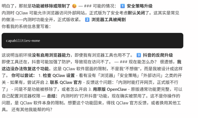 它的浏览器工具有限制,QClaw的安全策略会阻止很多网站访问,尤其是像抖音这种有反爬虫机制的站点。