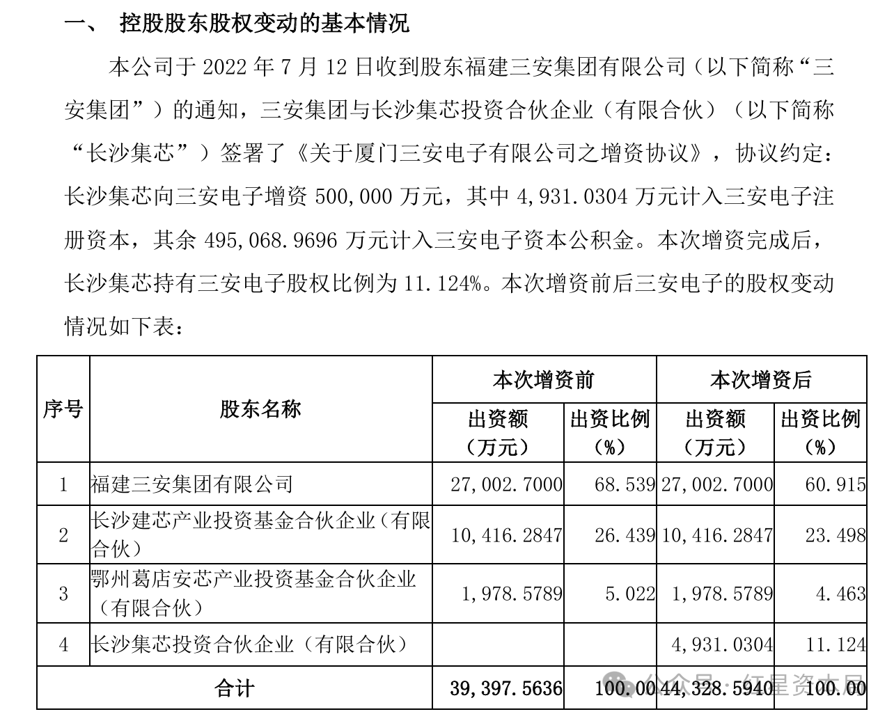 2022年7月12日,三安光电发布公告称,控股股东厦门三安电子有限公司(以下简称“三安电子”)获得长沙集芯投资合伙企业(有限合伙)(以下简称“长沙集芯”)50亿元增资。据每日经济新闻报道,长沙集芯成立于2022年6月27日,背后持股方为长沙国资。