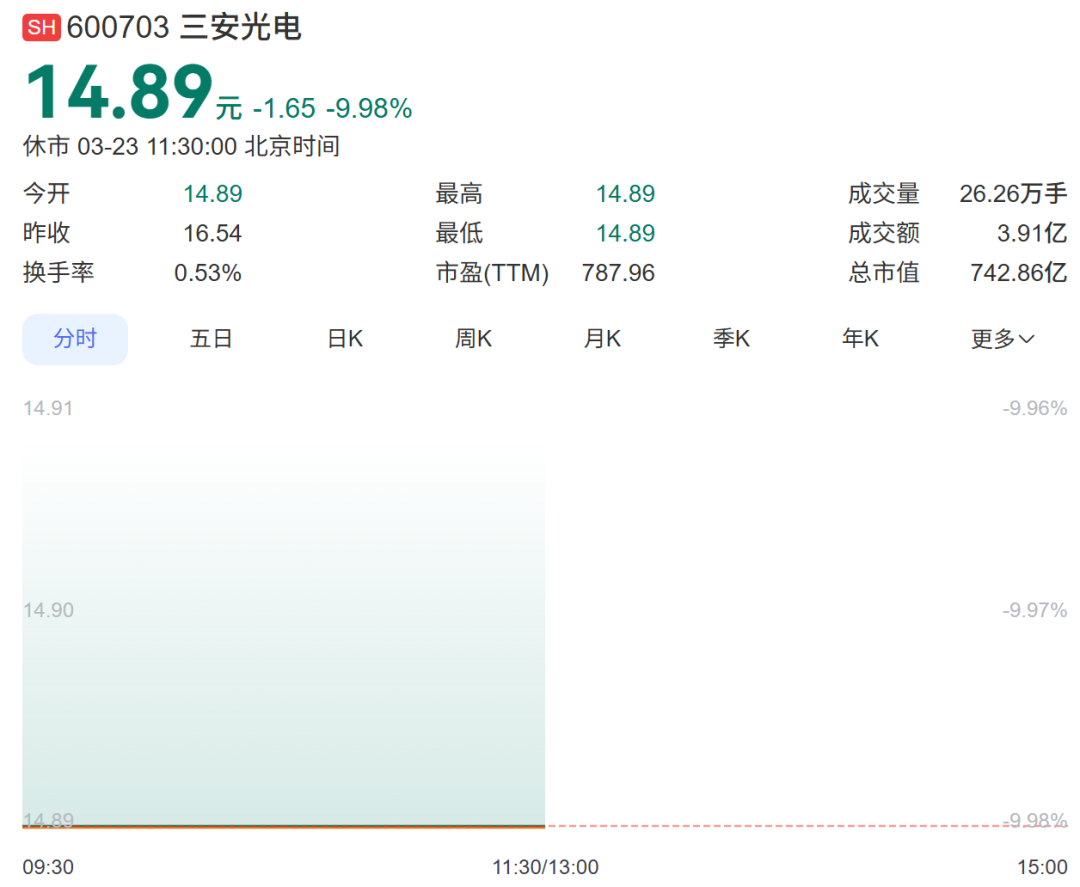 3月23日,知名LED龙头三安光电(600703.SH)开盘一字跌停。截至发稿,报14.89元/股,总市值从800多亿元缩小至742.9亿元。