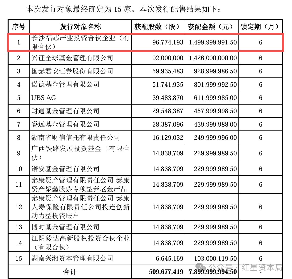2022年12月,三安光电以每股15.5元的价格向15位投资者发行5.1亿股股票,股份锁定期为6个月。此次定增,三安光电募集资金总额约79亿元。此次参与定增的15位投资者中,有地方国资背景的老股东长沙先导产业通过长沙福芯向三安光电投资约15亿元,获配9677万股股份。