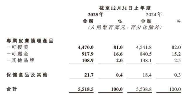 可复美——这个一度被视为公司增长引擎的拳头品牌,2025年遭遇挫折,实现营收44.7亿元,同比下降1.6%,占公司总营收比重仍超80%。公司方面将原因归结为“外部冲击”与“行业价格竞争加剧”,但从更深层次看,这暴露了其渠道结构的高度脆弱性。