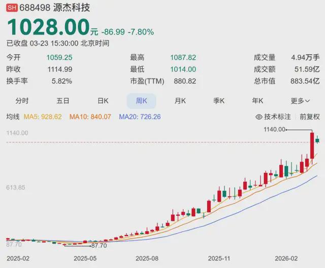 上周五,股市里蹿出一匹黑马——源杰科技,股价一头冲上1114.99元,直接把曾经的“AI芯片第一股”寒武纪给超了,成了A股里第二贵的大佬。今天大盘虽然晃悠了两下,但它还是稳稳站在千元线上。