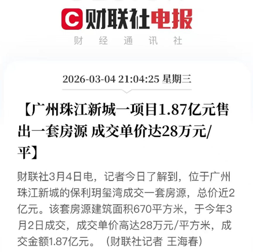 紧接着,3月2日,保利玥玺湾又成交一套约670平方米房源,总价1.87亿元,单价28万元/平方米,刷新广州一手顶级豪宅单价纪录。