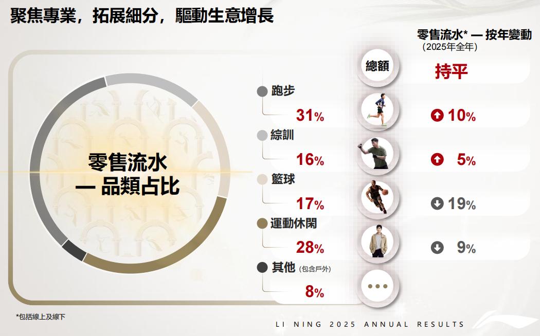 尽管在跑步及羽毛球两大赛道有不错的表现,在篮球、运动休闲,李宁的流水却分别下跌了19%和9%。