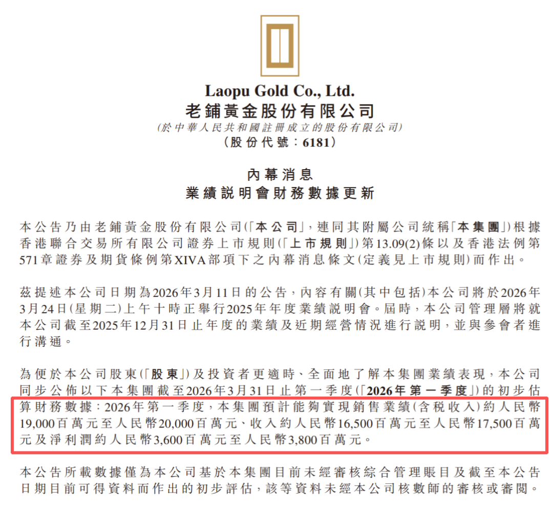 在业绩发布的同时,老铺黄金还发布了2026年一季度的业绩预估!