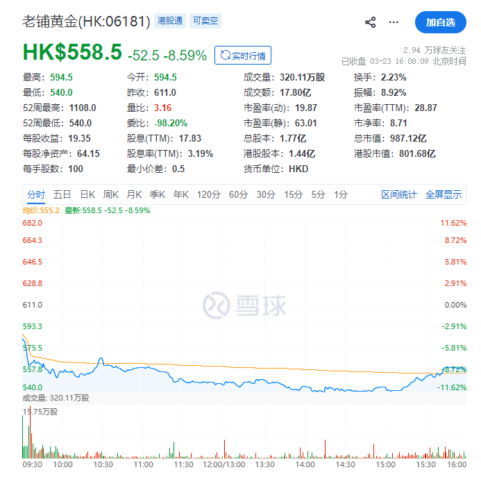 比如今天,老铺黄金的股价,就一度跌了超过11个点,最终收盘,也跌了超8个点。