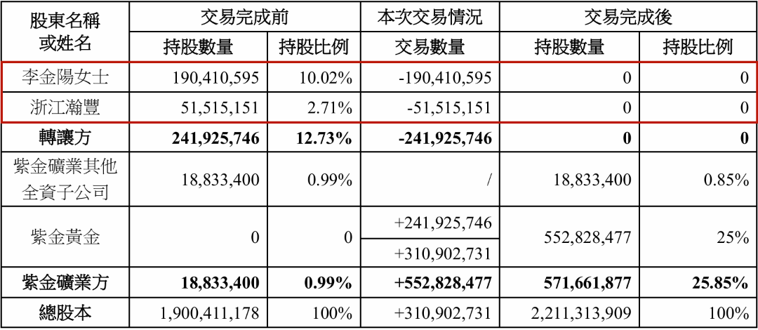 交易完成后,紫金矿业全资子公司将持有赤峰黄金约25.85%的股份,并取得控制权,赤峰黄金实控人也将由自然人转为地方政府——福建省上杭县财政局。