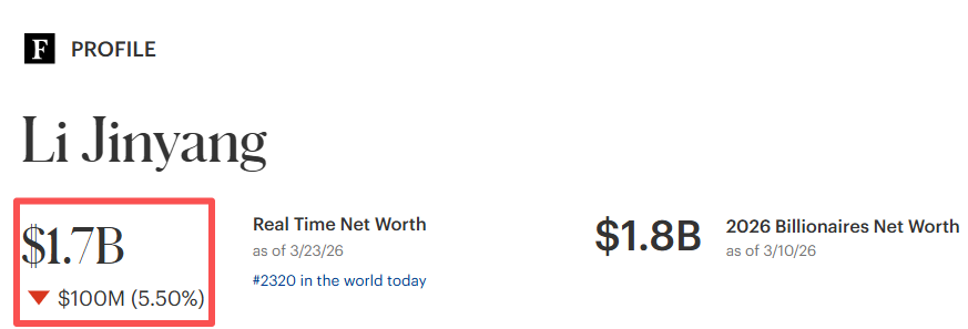 而福布斯实时富豪榜显示,李金阳目前拥有17亿美元(约合人民币117亿元)财富,在全球排第2320位。