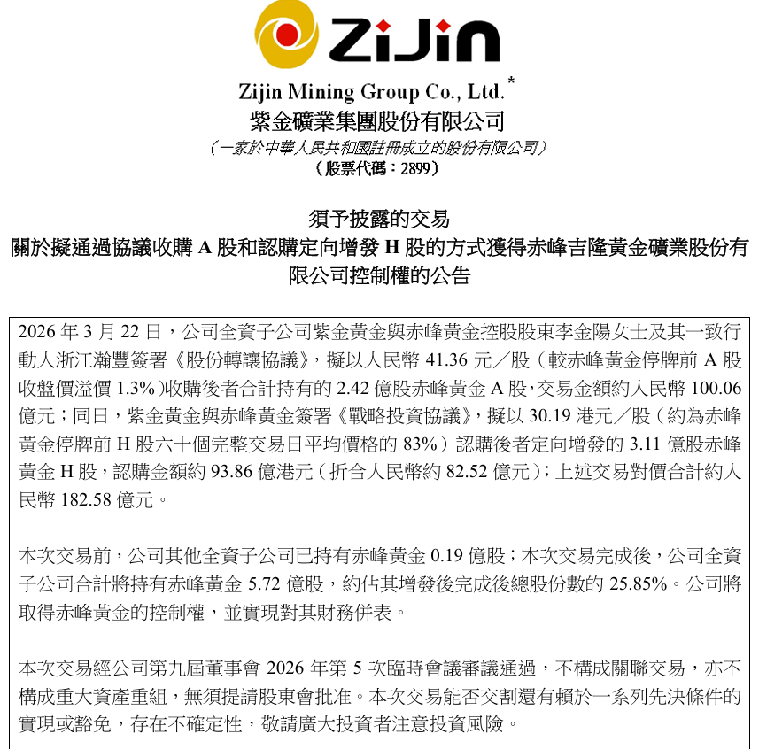 3月22日,紫金矿业(02899.HK,601899.SH)通过旗下全资子公司紫金黄金(集团)有限公司(简称“紫金黄金”),与赤峰黄金控股股东李金阳及其一致行动人浙江瀚丰创业投资合伙企业(有限合伙) (简称“瀚丰创投”)签署股份转让协议,拟以41.36元/股的价格收购后者合计持有的约2.42亿股赤峰黄金A股股份,交易金额约100.06亿元。