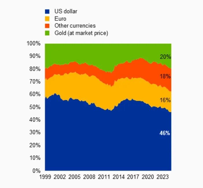 而欧洲央行更是在2025年的报告中提到,黄金在各国外汇储备中的占比明显上升,2024年全球储备资产中黄金占比达20%,超过欧元的16%,仅低于美元的46%,黄金成为全球第二大储备资产。