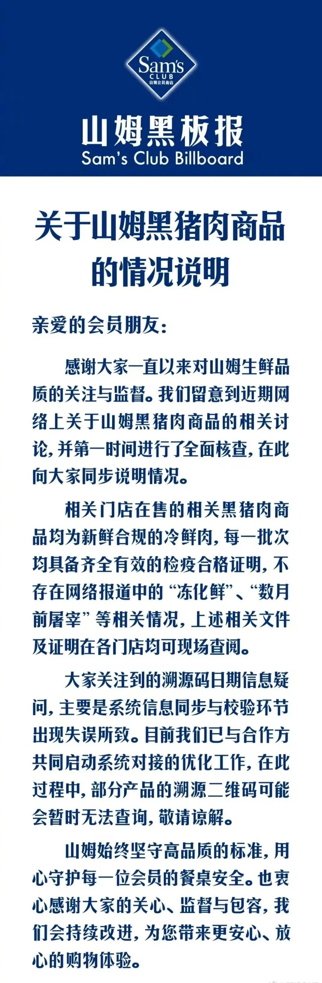 3月22日,山姆发布《关于山姆黑猪肉商品的情况说明》,进一步细化回应内容。声明中明确,涉事门店在售的相关黑猪肉商品均为新鲜合规的冷鲜肉,每一批次都具备齐全有效的检疫合格证明,不存在网络报道中的“冻化鲜”“数月前屠宰”等相关情况,上述相关文件及证明可查。
