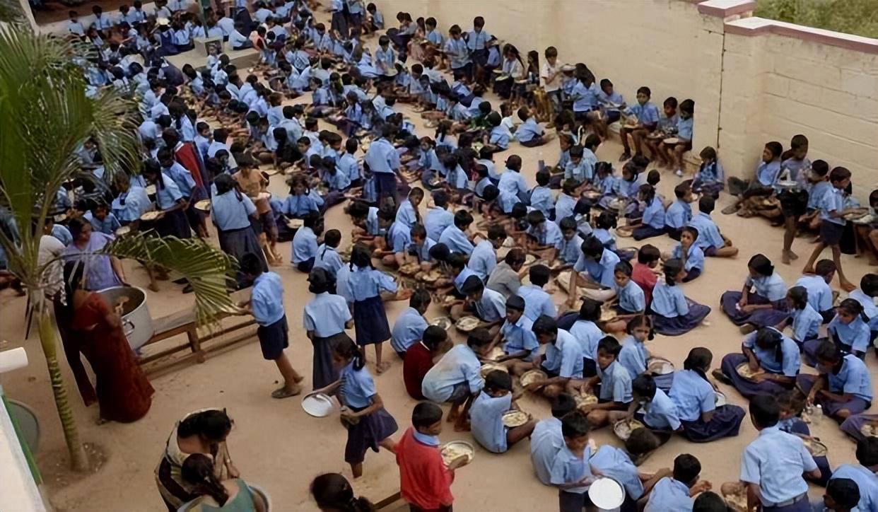 印度学生坐在简陋的“操场”上吃午饭,因为他们的学校没有食堂