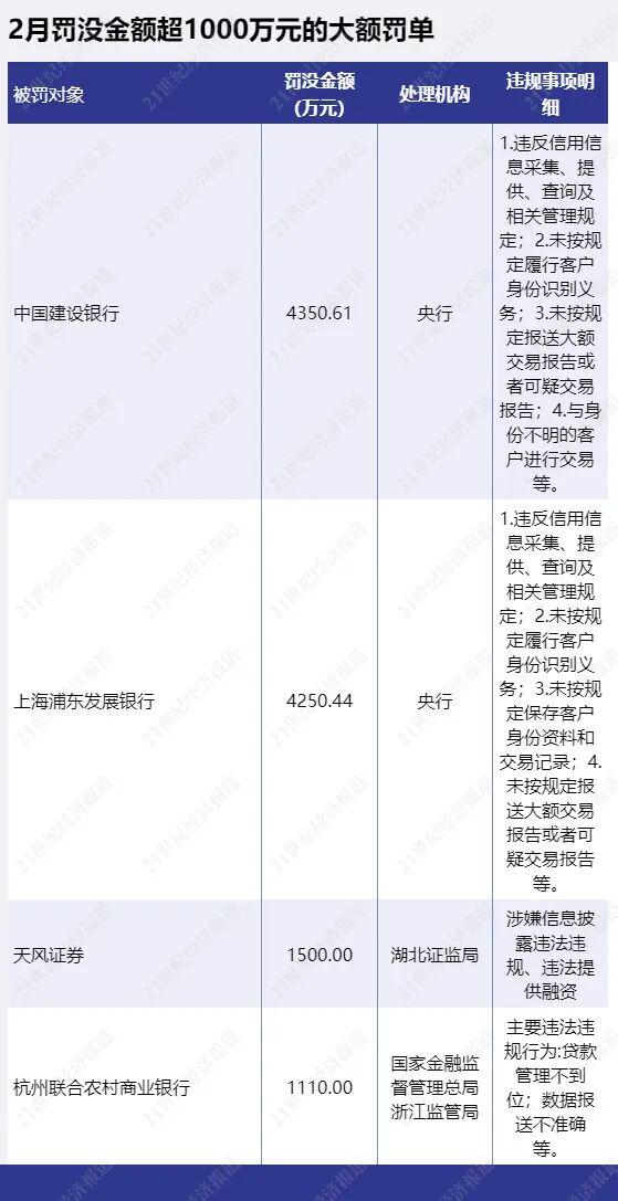 2月有22家银行、1家证券公司(大同证券)、1家保险公司(建信人寿保险)因“未按照规定开展客户尽职调查”等违法违规行为被处罚。