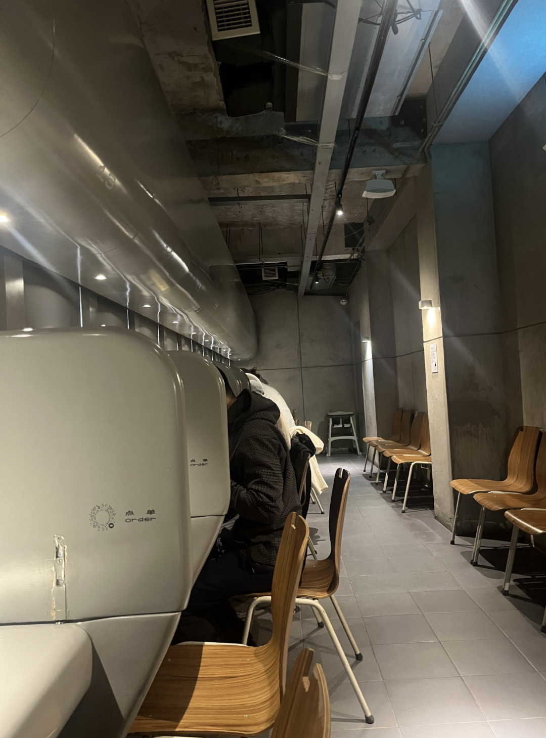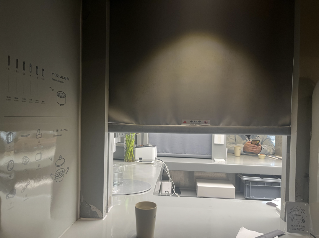 我的脑袋缓缓冒出一个问号,想着不会是电动帘卡出bug了吧,发现对面一位先生的帘子也是停在相同的高度,只能瞅见他的肩膀和手臂。不过一会儿,他点的面来了,服务员上完餐后,帘子就缓缓下降,合上了。