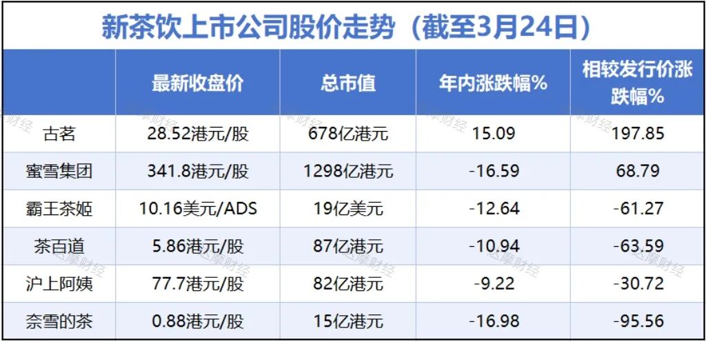同在去年上市的古茗成为新茶饮行业的“股价黑马”,截至3月24日,公司股价收于28.52港元/股,总市值为678亿港元。古茗是2026年唯一一家股价上涨的新茶饮品牌,目前其股价较发行价上涨了近2倍。