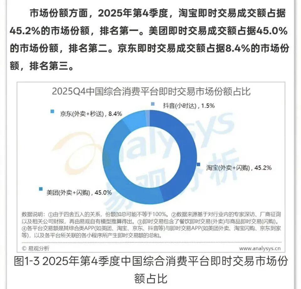 根据第三方权威机构易观分析(Analysys)最新发布的《2025年中国即时零售市场年度报告》,即时零售与外卖市场的格局在2025年第四季度发生了剧变: