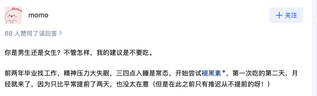 就拿“吃一粒就立马能睡着”的褪黑素为例,在各式宣传语的轰炸下,保健品都快成了“神药”,而在知乎热门问答“有没有吃过什么褪黑素牌子较好的推荐”下面,评论区却成了大型戒断现场,备孕不要吃、日常不要吃、身体状态不好时也不要吃,不少尝试过的网友现身说法“千万别当它日常用品一样消耗”。