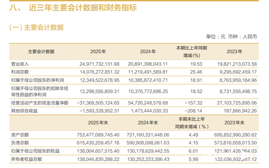 2025年,招商证券披露的年度报告显示,公司在“十四五”收官之年实现经营业绩稳步增长。全年营业收入249.7亿元,同比增长19.53%,连续三年保持增长;归母净利润123.5亿元,同比增长18.91%。