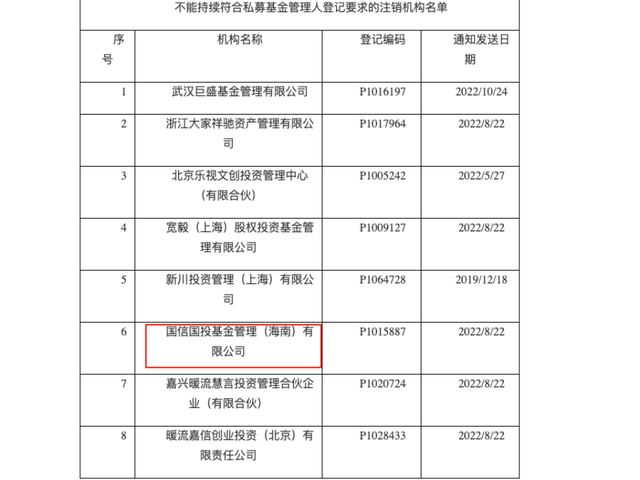 拓择汇利的前身是一家私募基金——国信国投基金管理(海南)有限公司。而2023年3月,中国证券投资基金业协会官网曾发布一则自律管理信息,注销了8家不能持续符合管理人登记要求的私募基金管理人登记,其中就包括国信国投基金管理(海南)有限公司。
