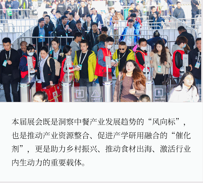 本届展会以“以展造节、餐食界共进大聚会”为主题,展览面积达35万平方米,汇聚6千多家食材&设备厂家,带来数万款全品类产品,规模再创行业新高。展会创新打造食材上新节、餐食品牌节、餐食客户节、餐食生态节、餐食出海节、电商订货节、流量宣发节七大节庆活动,全方位覆盖食材采购、产品创新、供需对接、交流合作、发展探讨等核心需求,构建起一站式专业服务平台。并以头部引领之势,聚资源、结力量、建生态、促发展,携手产业各界推动中餐行业高质量发展。