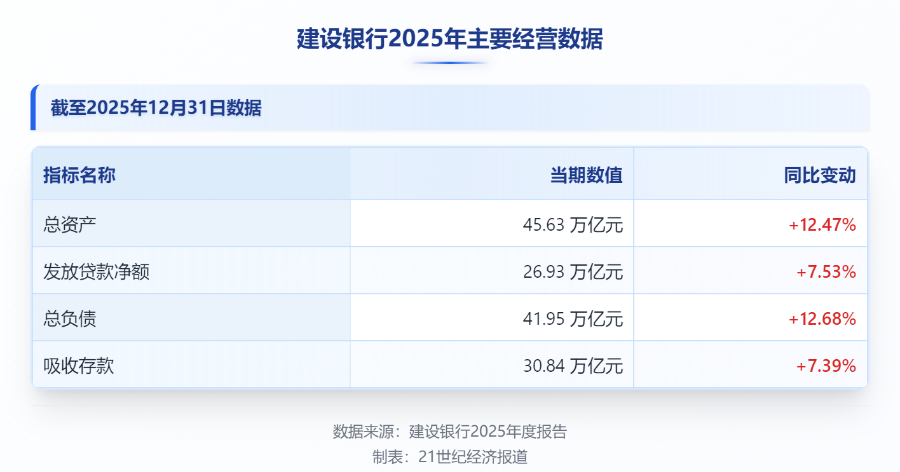 截至2025年末,建设银行资产总额达45.63万亿元,较上年增加5.06万亿元,增幅12.47%;负债总额41.95万亿元,较上年增加4.72万亿元,增幅12.68%。