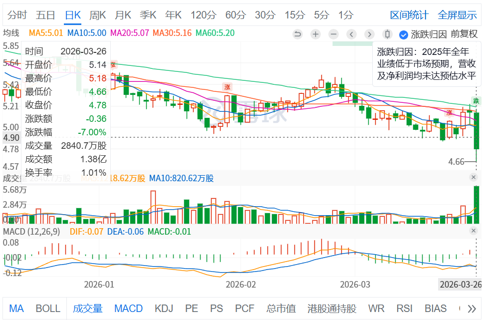 特步国际的遭遇更为惨淡,26日午后盘中大跌逾9%,一度探至4.66港元/股,创下自去年4月以来的新低,截至收盘报4.78港元/股,跌幅7%,总市值约134亿港元。
