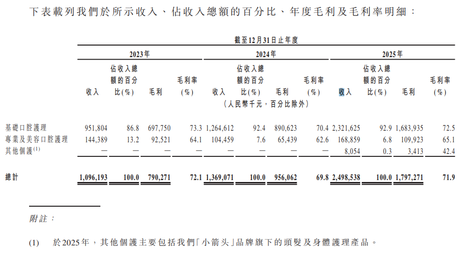 其他个护业务则是小箭头品牌旗下的头发和身体护理产品,该品牌于2025年推出,当年该业务营收805.4万元,占总营收的0.3%,毛利率为42.4%,毛利率不及集团的其余两大业务。